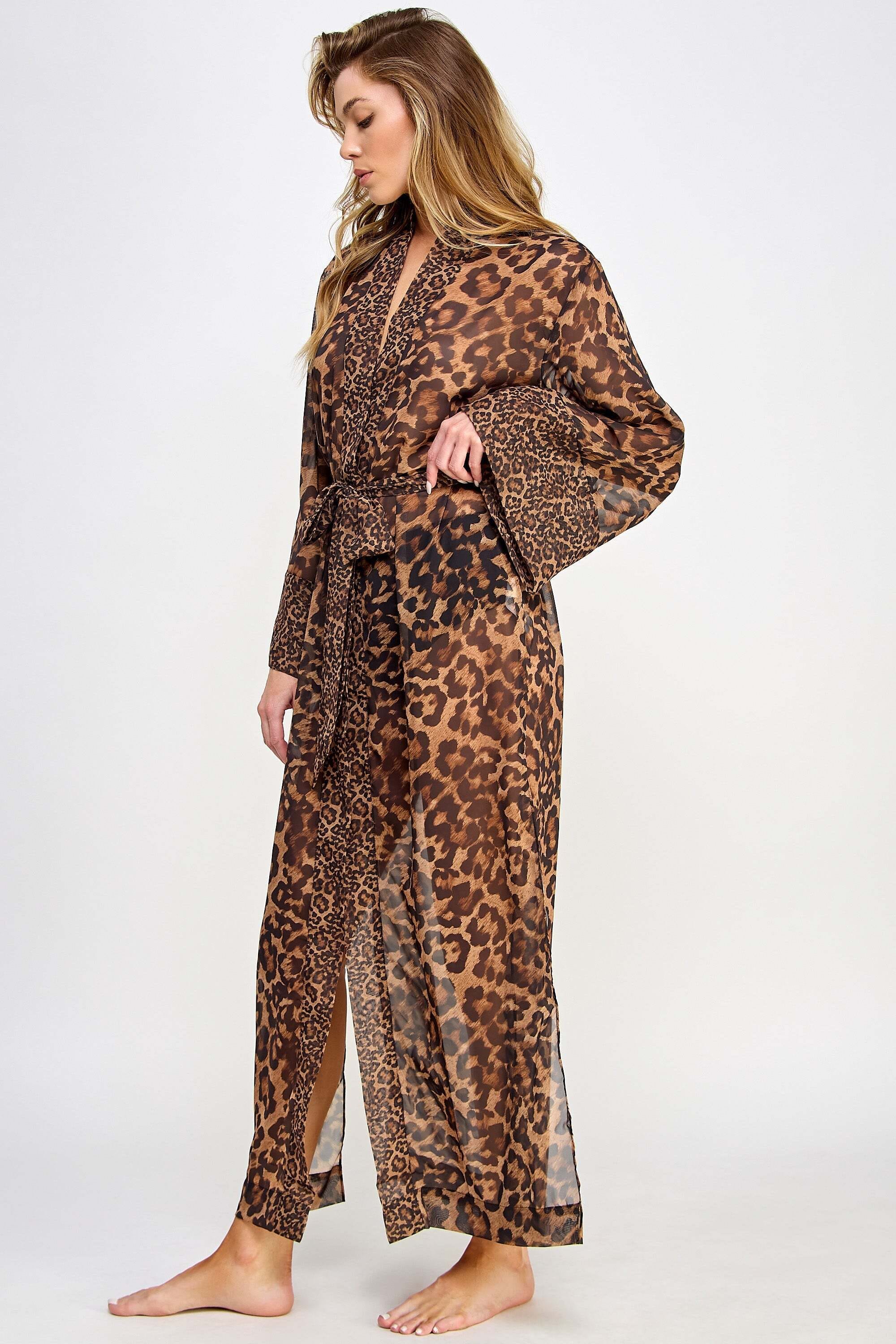 The luxurious Juliana Robe is a must-add to your loungewear wardrobe This luxurious robe is made of contrasting leopard print chiffon that adds a touch of chic elegance Contrasting leopard print Sheer chiffon Long sleeves Front tie matching belt Side slit