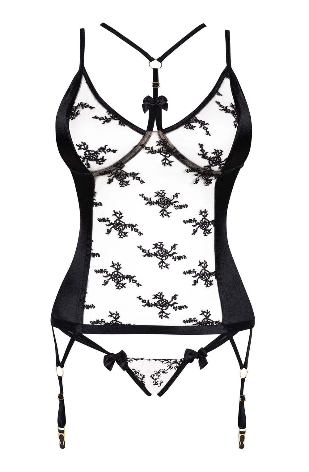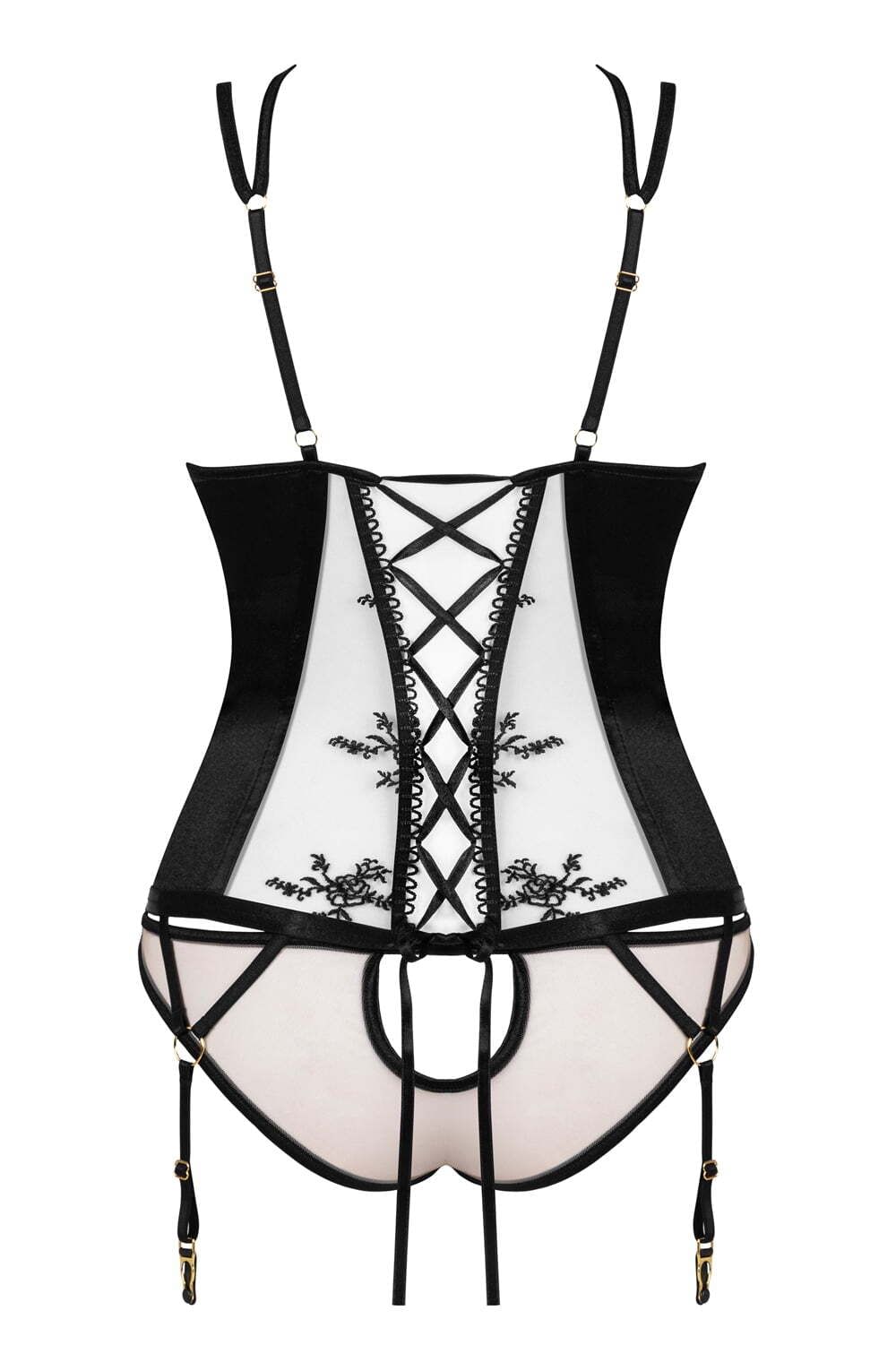 Discover the epitome of sophistication with our exclusive corset, seamlessly blending classic charm with modern allure. Crafted from nude tulle embellished with a stunning black floral pattern, and featuring elastic satin that hugs the body, this corset offers a perfect fusion of style and comfort.Adorned with eye-catching lacing at the back, this corset ensures a flattering fit while exuding captivating elegance. The neckline, linked to adjustable straps with a strap, adds an element of chic detailing.Complete with matching panties in the same motif, this set is presented in an elegant package, featuring a photo showcasing the product’s exquisite beauty. Elevate your lingerie collection with this enchanting set.