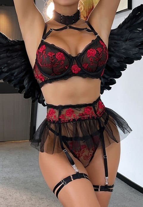 Tease the lap of sexy in this exclusive lingerie set featuring a sheer underwire cups, a high strappy neckline with a back hook closure, adjustable spaghetti straps, a hook and eye back closure, a matching high waisted garter belt with a hook back closure, adjustable garter straps, adjustable leg garters, and a matching panty with a thong cut back.