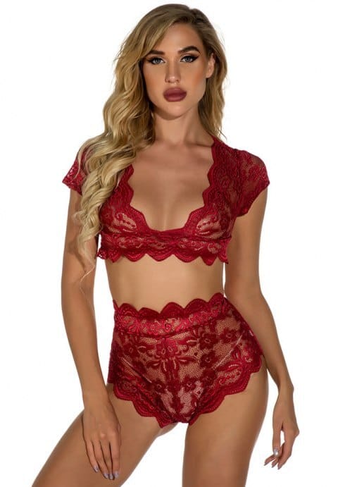 Entice your lover with subtle seduction in this enticing bra set featuring a lace bra top with sheer cups, a scalloped trim, and a matching high waisted panty with and a cheeky cut back.