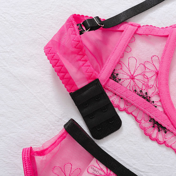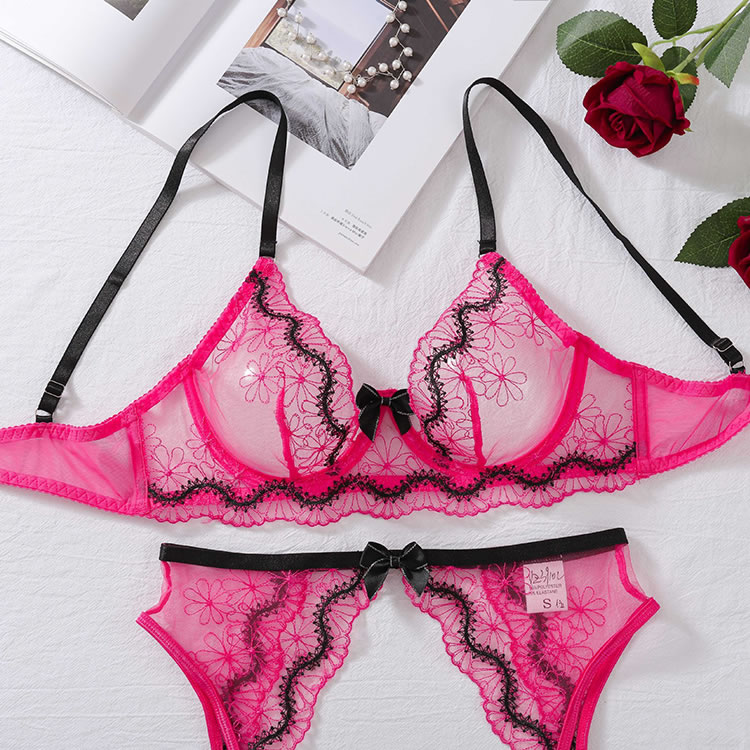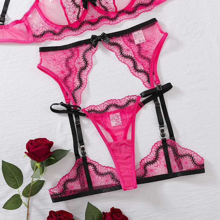 Ignite passion with this exquisite lace bra set. It features sheer lace underwire cups adorned with satin bow accents, adjustable spaghetti straps, and a hook-and-eye back closure. The set includes a matching garter belt with adjustable garter straps, wraparound leg garters, and a thong panty for a complete, seductive look. Perfect for adding a touch of allure to any evening.