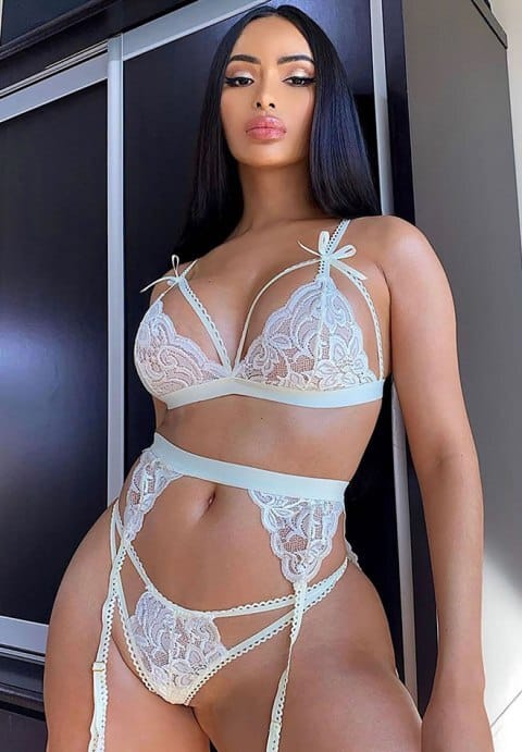 This seductive bra set features sheer lace cups with strappy detailing, satin bow accents, adjustable spaghetti straps, a hook and eye back closure, a matching high waisted garter belt, adjustable garter straps, a hook and eye back closure, and a matching panty with a thong cut back. (Thigh high stockings not included.)