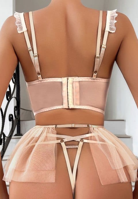 Surprise your lover with this seductive lace bra set, featuring sheer mesh underwire cups adorned with elegant embroidery. Adjustable spaghetti straps and a hook-and-eye back closure ensure a flawless fit. Complete the look with a matching high-waisted garter belt, adjustable garter straps, and a coordinating thong panty.