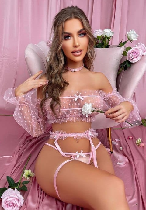 Tempt and tease in this sexy set featuring a crop top with an off-the-shoulder neckline, long sleeves, and a matching high waisted garter belt with adjustable garter straps, wraparound leg garters, a pink choker, and a matching g-string.