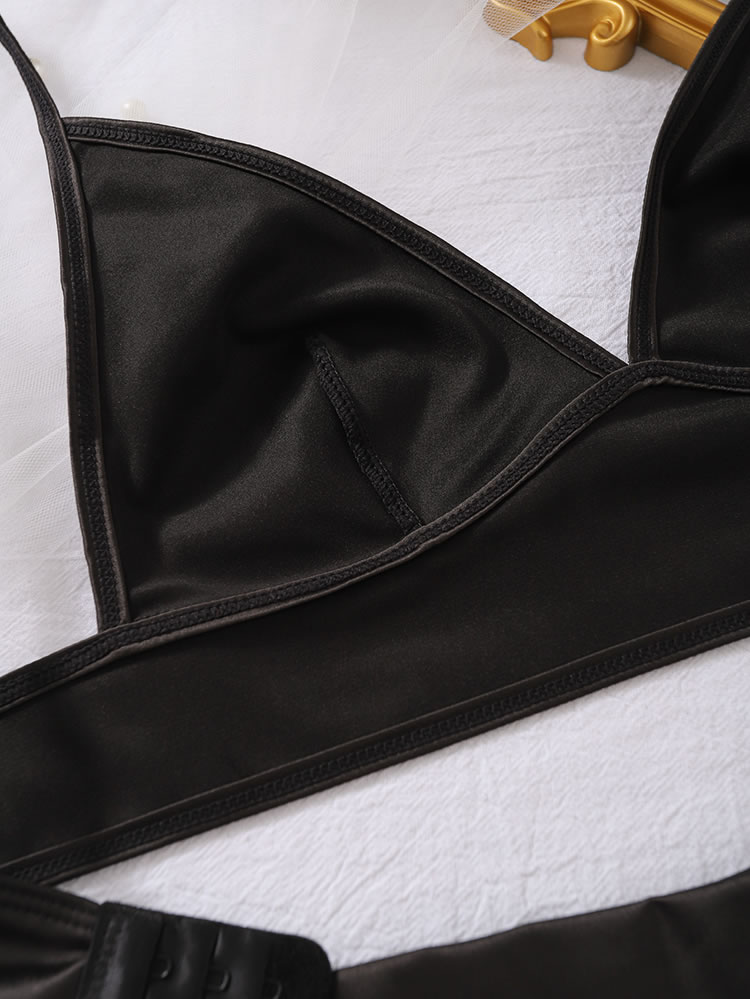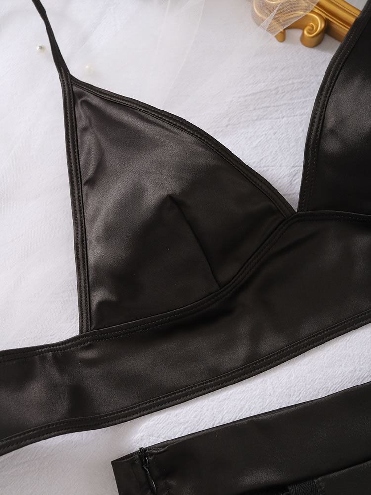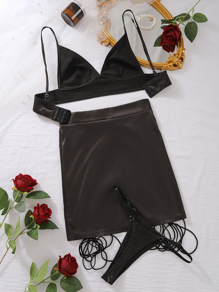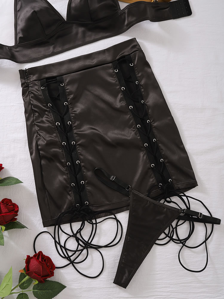 Slip into something more comfortable like this sexy bra set featuring solid Triangle cups, adjustable spaghetti straps, a hook and eye back closure, a high waisted mini skirt with a lace-up sides closure, and a matching thong panty.