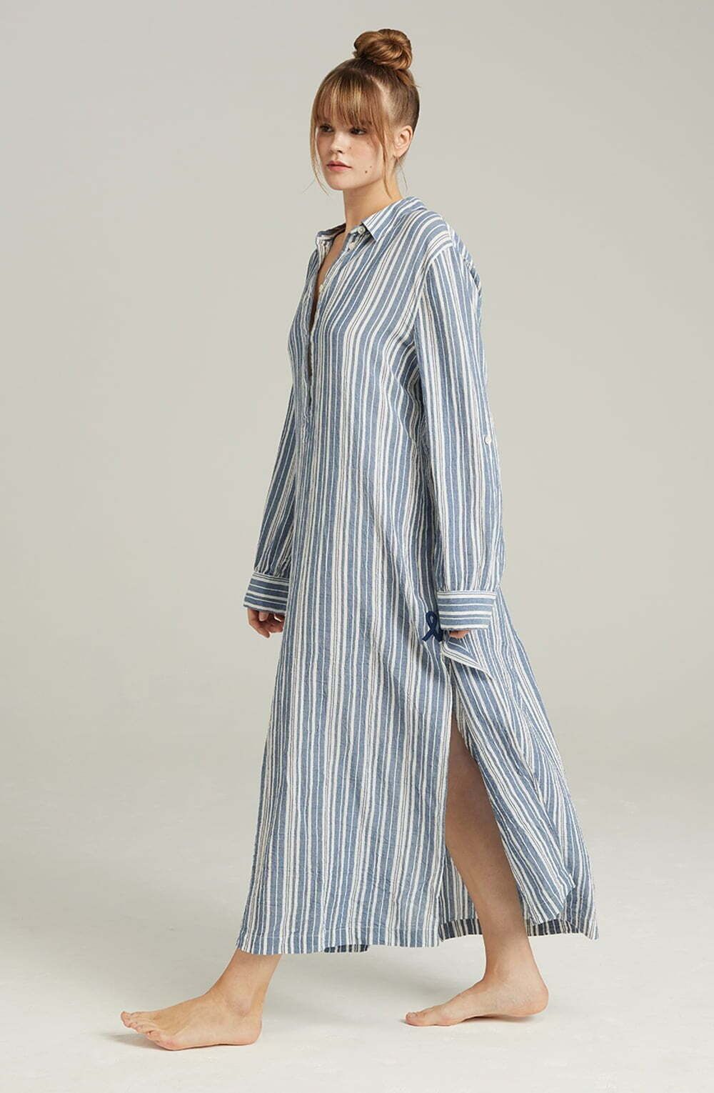 Discover effortless elegance in bed and beyond with this 100% organic cotton maxi shirt with chic side slits. Adorned with signature Nudea detailing, mother-of-pearl buttons and thigh-high side slits, this luxe silhouette will have you feeling oh-so-chic as you drift off to sleep.